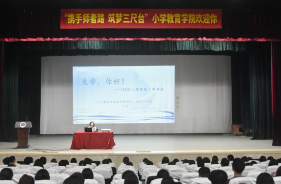 为进一步提高大学生的心理素质,促进学生身心健康的发展,2023年9月16日上午,我院大礼堂开展以“大学,你好”为主题的心理健康教育讲座,讲座由小学教育学院王芳老师主讲,2023级小学教育学院全体新生参与此次讲座。