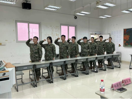全体退伍士兵起立,在梁煜老师的带领下庄严宣誓“退伍不褪色,我心终向党,坚定跟党走,争做新青年,树立好榜样,共建美好校园”。