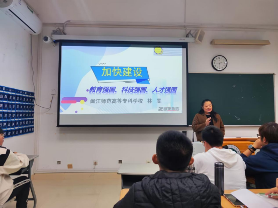2023年11月22日晚上,校党委副书记林旻走进思政课堂,以“加快建设教育强国、科技强国、人才强国”为主题给2023级小学教育(3+2)专业学生上了一堂形势与政策课。