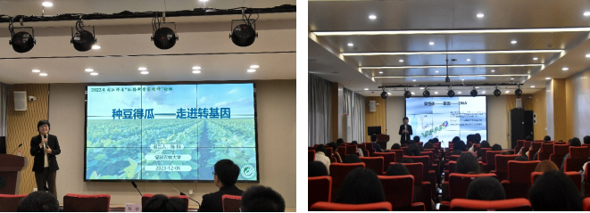 报告中,陈栩教授以浅显的语言,讲述了转基因技术在农业方面的应用,如改良植物基因增加产量、提高抗病虫害能力等,介绍了常见的转基因农作物也分析了大众所关心的转基因食品的安全问题。同时也分享了实验室所做的耐密植型大豆、高蛋白型大豆、高固氮大豆等转基因品种的研究,让更多的人了解到科研人员在探索现代生物技术方面的努力与付出。报告结束后,同学们向陈栩教授提了很多关于转基因的应用问题,陈教授简练的回答让同学们觉得原来转基因并没有那么遥不可及。
