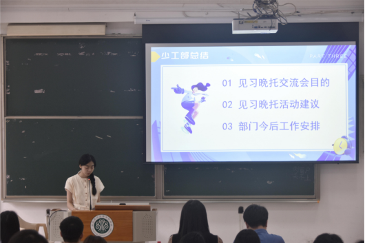 最后,团委少工部干事陈婧怡对见习晚托工作进行总结,并提出学习通资料库已开放使用以及下一阶段的实践活动设想,针对见习晚托活动中的难题提出有效解决方案,鼓励同学们充分利用学习资源,做到有问题及时沟通,有疑惑及时解决。