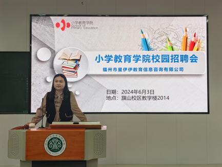 为落实我院毕业生工作的决策部署,全面推动2024届毕业生充分高质量就业,搭建毕业生和用人单位交流平台,为就业工作保驾护航。2024年6月3日下午在旗山校区教学楼2014,小学教育学院举办福州市星伊伊教育信息咨询有限公司校园招聘宣讲会,毕业班全体学生参与,会议由辅导员林丽芳老师主持。