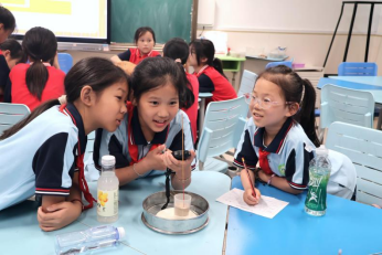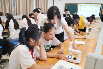随着时间的推移,同学们来到实验环节。在“摩擦产生静电”实验区,孩子们兴奋地将气球在头发上摩擦,看着塑料片神奇地被吸附起来。显微镜前,通过志愿者们手把手指导调焦,同学们发现了洋葱里隐藏的神秘世界。
