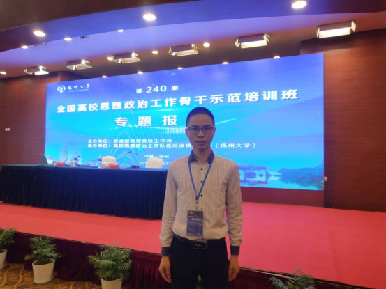 4月25-27日,第240期全国高校思想政治工作骨干示范培训班在江苏省扬州市扬州大学举办,本次培训班由教育部思政司主办,高校思想政治工作队伍培训研修中心(扬州大学)承办。来自部直属高校和各省区市高校的90余名思想政治工作骨干参加培训,我系辅导员刘志杰老师参加培训。