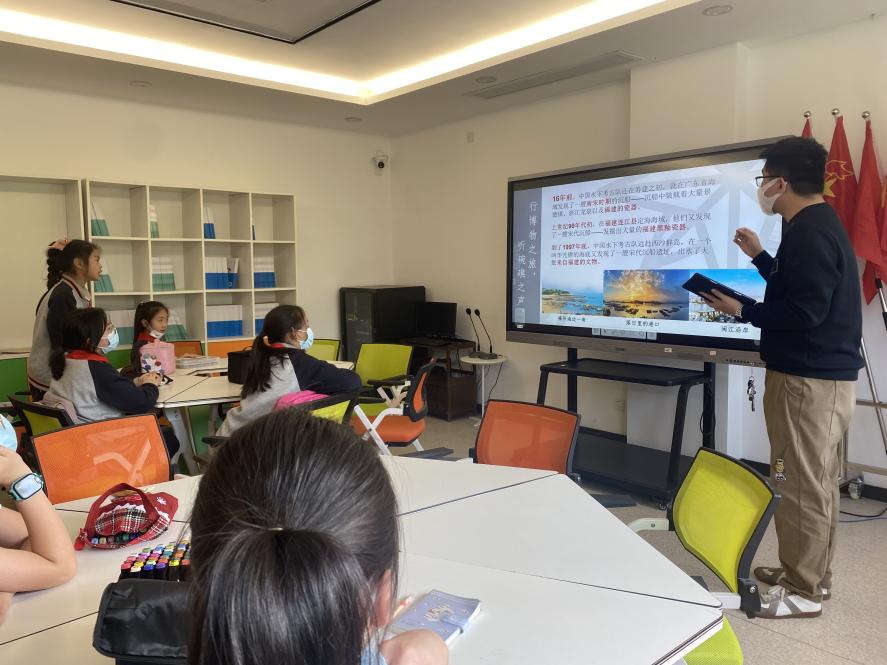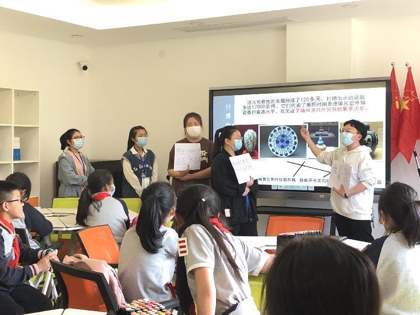 如果说长江流域的青铜文化已经足足引起了同学们对于探索文物的好奇心,那么同学们此时更加好奇:有没有在我们“家门口”出土的文物?小学教育学院学生刘松洋带领同学们从一艘“碗礁一号”探索到近几十年来出土的文物,都有鲜明的福建文化特征,从这些文物中不难发现,福州乃至福建的海洋文化地位是极为显著的。值得一提的是,21级学生黄灵蕊、张小欣、李春阳等六位同学根据“碗礁一号”出土的瓷器文物,以“小剧场”的形式为附小的同学们呈现了瓷器的特征,通过他们精彩的表演,同学们都能够快速地认出文物,场上一片欢声笑语,大学生和小学生们乐在其中,学在其中。