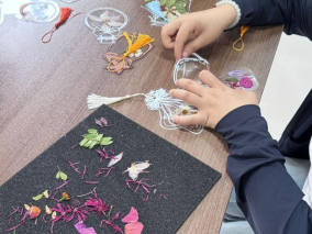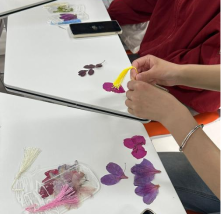 当活动正式开始后,同学们纷纷挑选了自己心仪的书签款式和干花干叶素材,尽情发挥自己的创意,巧妙运用奇思妙想,将干燥的花瓣与树叶拼贴成“春日校园”“节气小景”等富有主题性的作品。在镊子的起落之间,自然的意趣跃然纸上,一幅幅生动美丽的书签在同学们的巧手之下逐一诞生。
