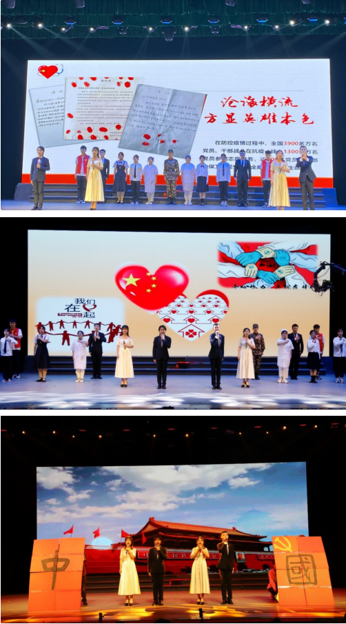 演出中,伴随着习近平总书记的讲话,同学们渐渐被带进2020年抗疫斗争中。悠扬而低沉的音乐慢慢跟进,跟随着主诵的声音,疫情的突如其来与危急展现在大家面前。前方是疫情,更是医护人员逆行而上,奋战前线的身影。我们仿佛看见医护人员的亲属满行的热泪与满怀的期盼,听见武汉震动、中国震动、世界震动!铿锵有力的朗诵声让我们感受到抗疫白衣天使们在与病魔搏斗、与死神抢人的生死时速。这时,“我是人民子弟兵!我是来自福建的护士!我是大学生支志愿者……”各行各业的人们都纷纷挺身而出,在危难之际,在生死关头,为人民群众筑起了一道坚实的生命保卫墙。当听到护士和未婚夫隔着疫区玻璃门饱含着深情的告白,当听到到工作到深夜的医护人员与母亲的电话……我们早已泪流满面。随着音乐的变化,鲜红的“中国”二字展现在舞台,大家一起高声呐喊——“让伟大的中国梦旭日东升!让伟大的中国梦旭日东升!”其震撼人心的力量,赢得了全场师生热烈的掌声。