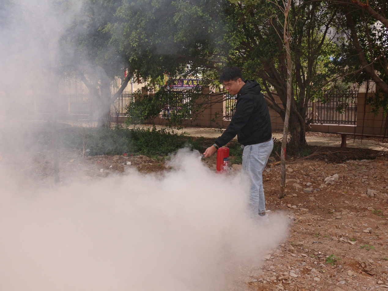 疏散演练结束后,福清校区保卫处组织校园义务消防队及保安人员进行灭火实操演练,演练内容包括灭火器的检查和使用步骤,有效使用距离、角度和站位等,参加演练人员分组进行了现场灭火操作。