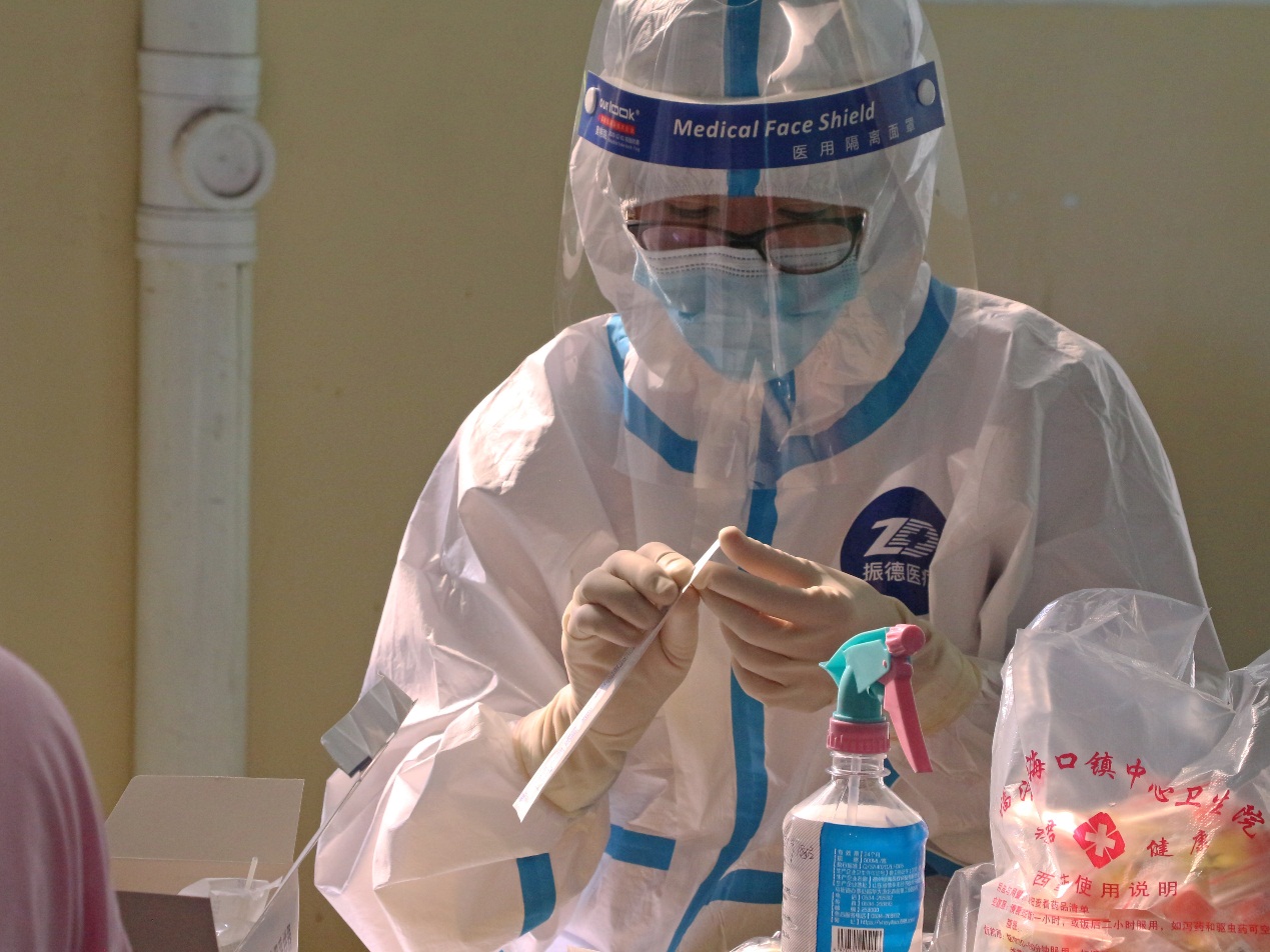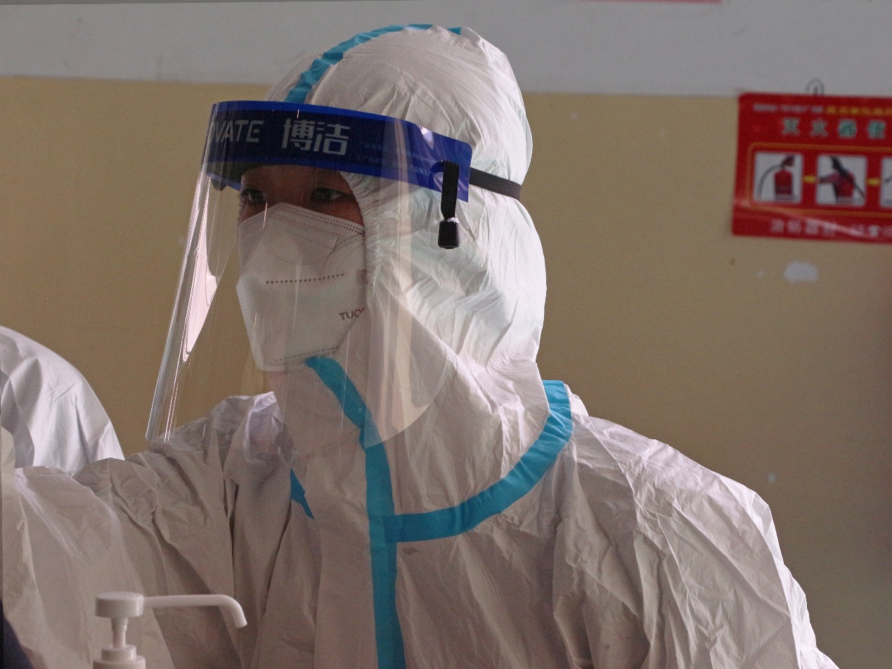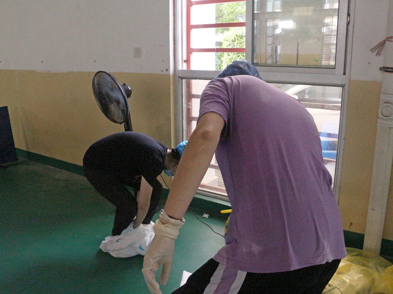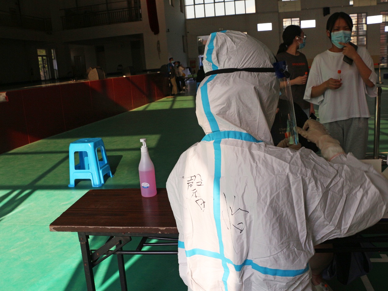 首次上岗的“大白”战队完成300多人核酸采集工作。核酸采集结束后,志愿者们仍未懈怠,严格遵守操作规范,从外到内、从上到下,一点一点“解除武装”。身上的衣服已经全部湿透,橡胶手套里全是汗水,只为打赢抗疫防控阻击战。