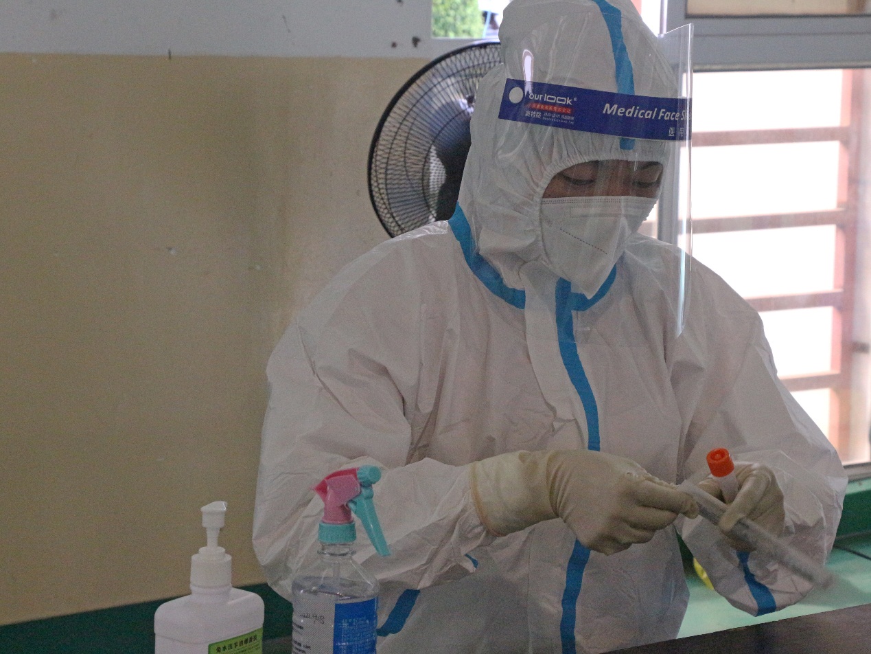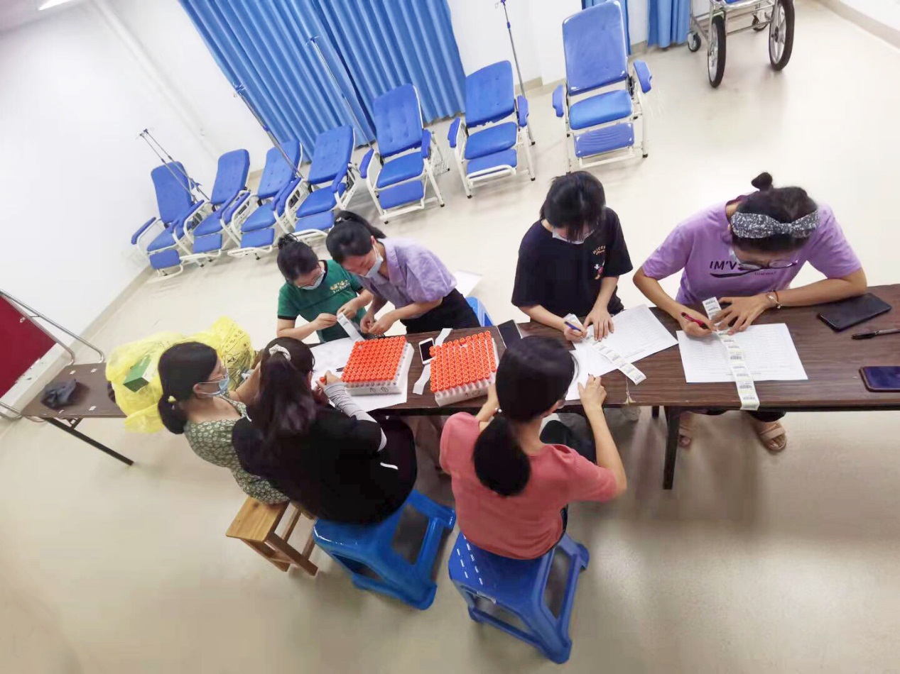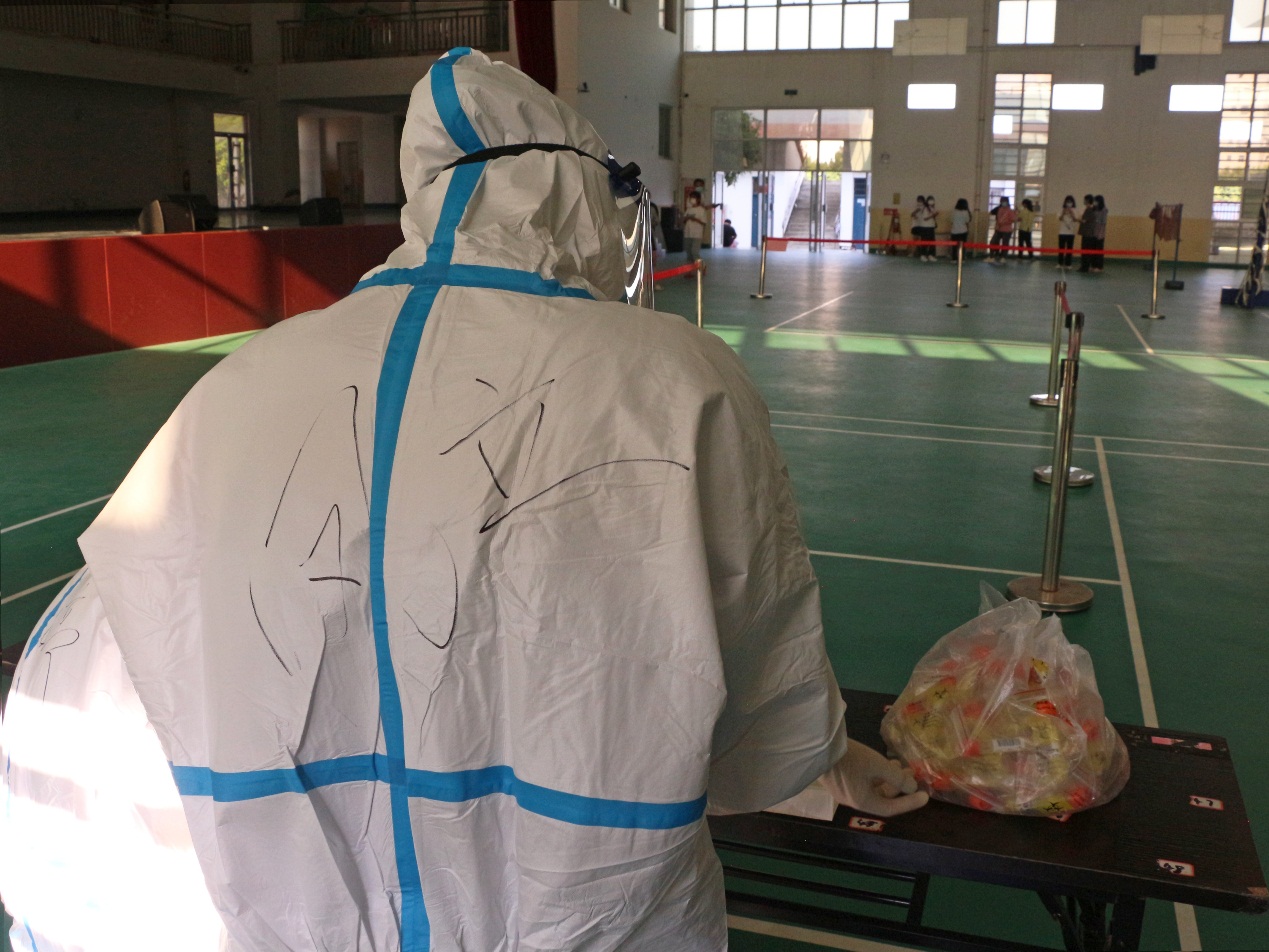 当天的最高气温达到32℃,志愿者们穿着密不透风的防护服,尽管已全身湿透,但是她们丝毫不敢松懈,只为尽快完成采集工作。