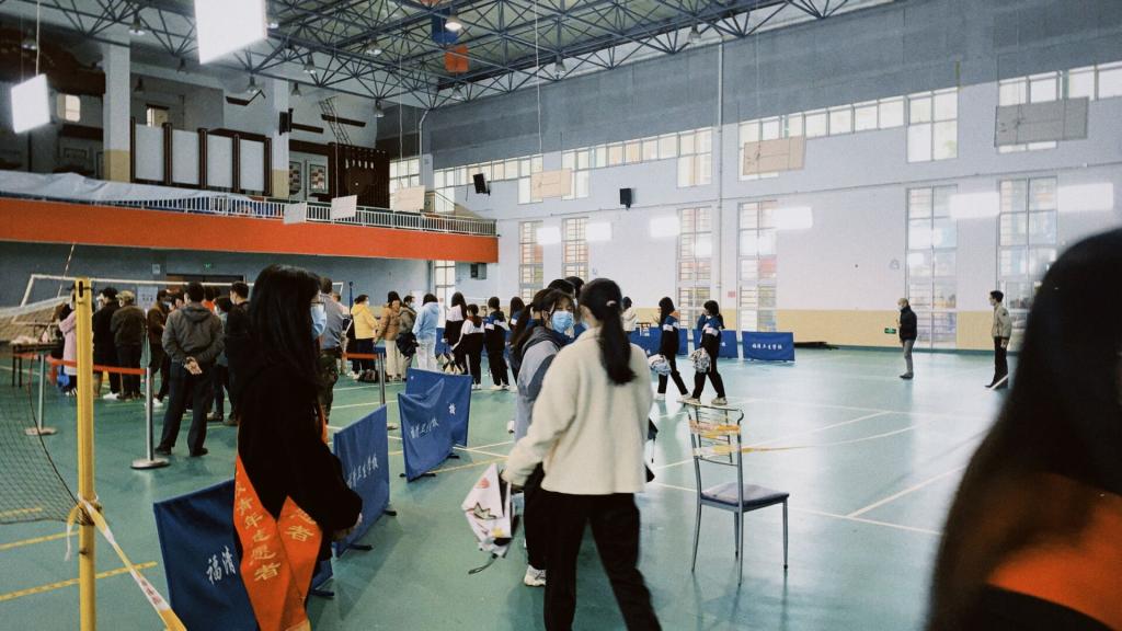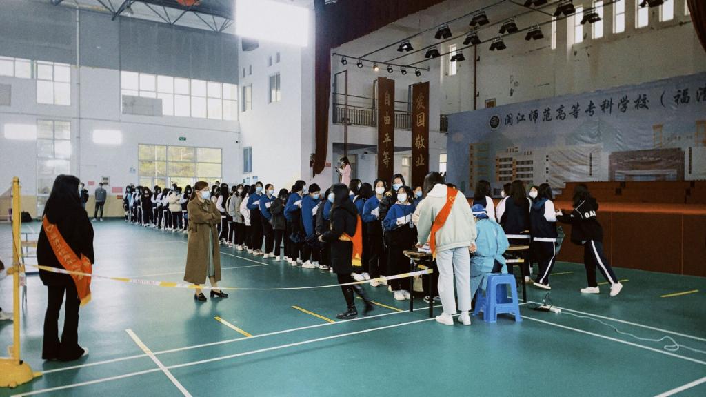 在劳动周期间,21护理2班9名同学到体艺馆协助福清校区现场疫情防控人员维持核酸采样现场秩序,引导师生、让排队的师生保持一米线的距离,安抚好大家的心情。