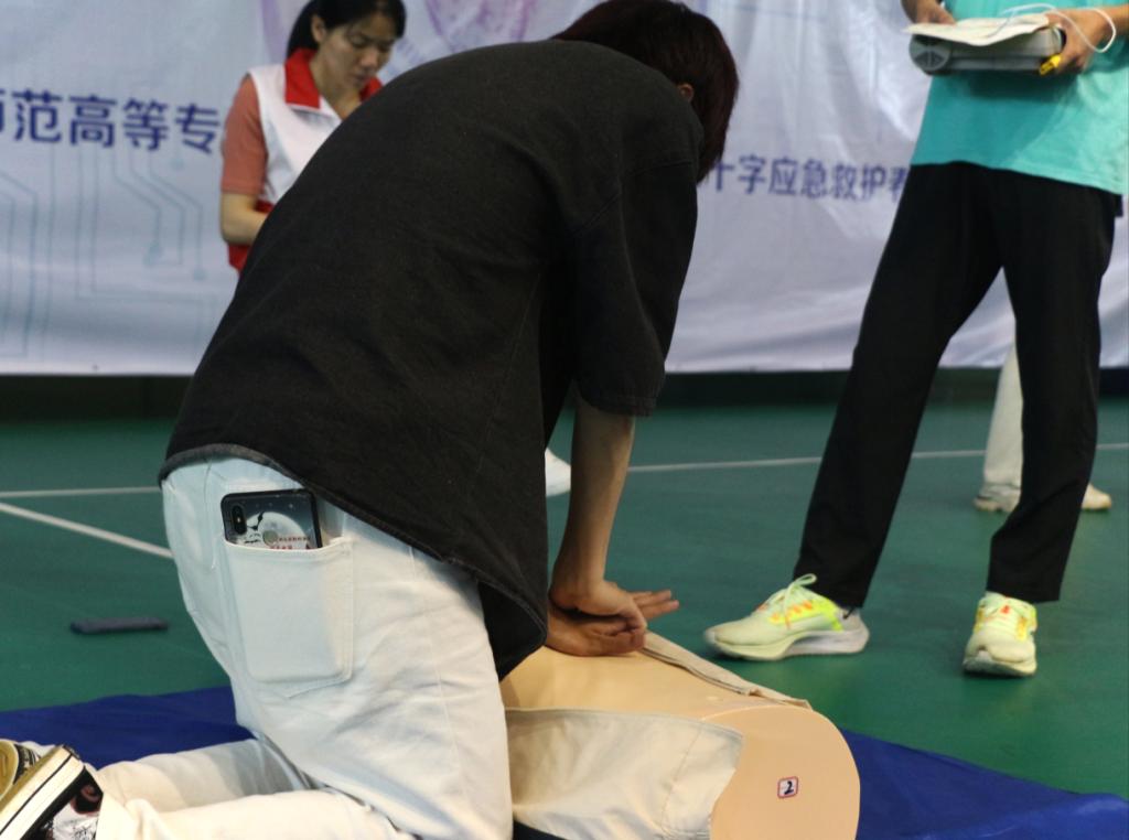 救护师资还运用模拟教具演示心肺复苏具体操作流程,并向大家示范自动体外除颤器(AED)的使用方法。同学们在救护师资们耐心指导下,分组进行心肺复苏和自动体外除颤器(AED)的实操练习,逐渐熟练掌握心肺复苏术。