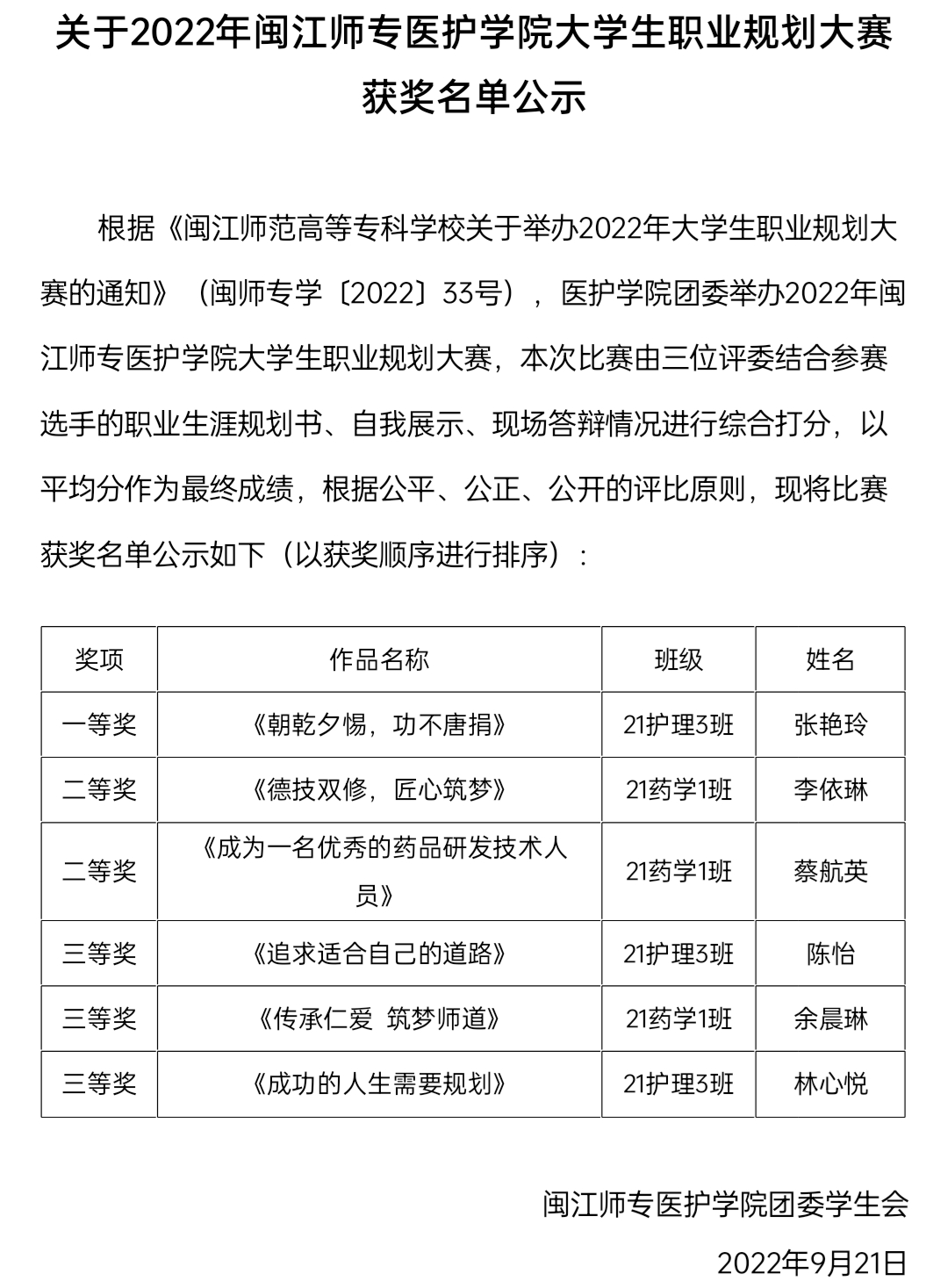 最终21护理3班张艳玲同学以及21药学1班李依琳同学分别以总分第一、总分第二的成绩成功进入校赛,希望她们再接再厉,争取在校赛中取得佳绩。