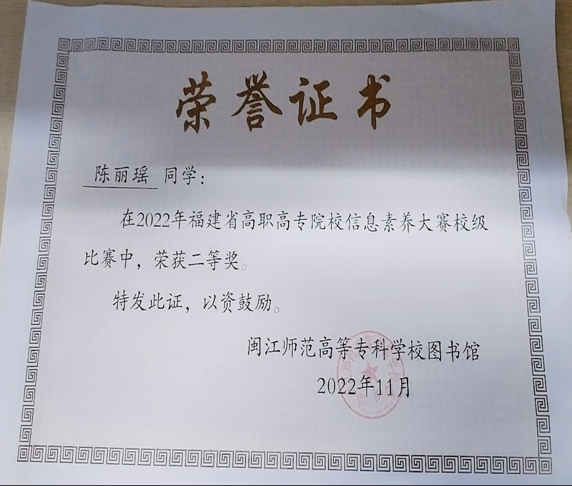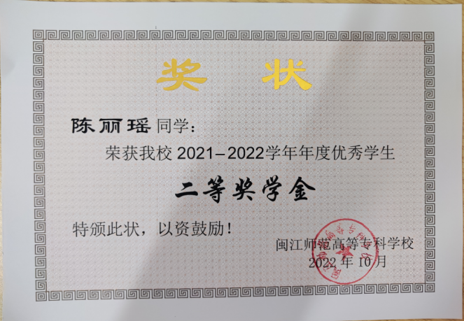 作为学习委员的她,一直严格要求自己,努力学好专业知识,熟练掌握护理操作技能;在学习之余,积极参加学校的各项活动,丰富大学生活。在校期间,获校级优秀学生“二等奖”和“三好学生”;福建省高职高专信息素养大赛校级“二等奖”;顺利通过了全国大学英语四级考试和计算机一级考试。同时,还取得了普通话二级甲等的资格证书。