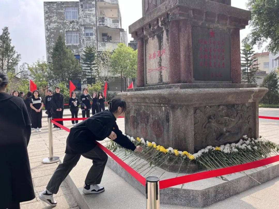 天地英雄气,千秋尚凛然。志愿者们先对墓碑周围进行清扫,而后,“志愿出行,缅怀先烈”清明祭扫活动在响亮的团歌声中开始,全体人员整队肃立,怀着崇敬的心情向革命先烈鞠躬、默哀。接着,志愿者们有序向烈士英雄纪念碑敬献花,表达对革命先烈的无限追思和崇高敬意面对高耸的烈士英雄纪念碑。最后,全体人员诵读《吻你,我不惊醒你》。“我知道尽管这排排石碑再不会复苏,但那魂归南疆的每一个英名却在这里永垂……”每一句诗歌,都让在场的志愿者们深受感染。