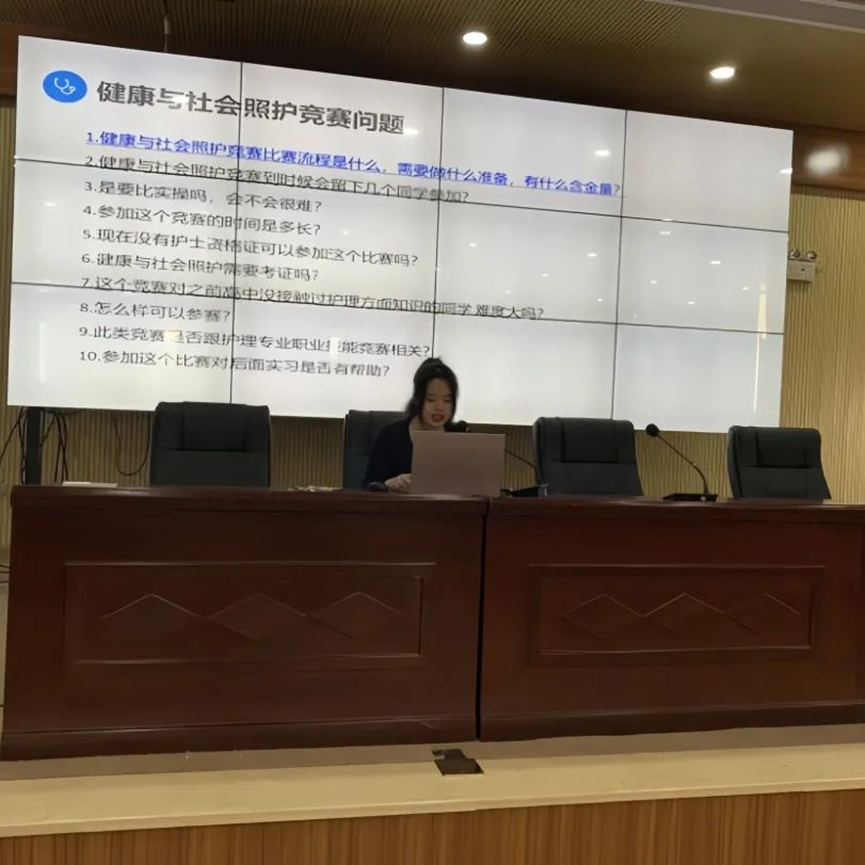 21级护理专业优秀学生谢莹学姐发言。她鼓励新生积极参加专业技能比赛。解答了新生们关于健康与社会照护比赛问题和流程以及实习相关问题。学长学姐表示不论大家的起点是什么,要成为什么样的人取决于自己的决心和付出的努力程度。