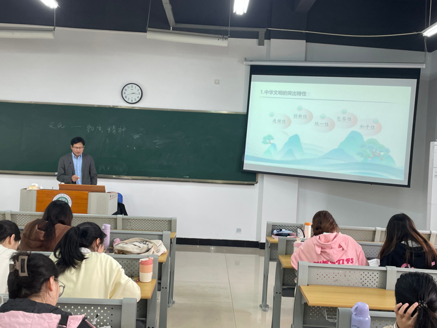 刘校长以“赓续历史文脉,谱写当代华章”为主题,围绕“何为文化、何为中华文化、何为文化自信、如何体现文化自信”等四个方面展开授课。他结合中华民族悠久的历史和独特的地理位置,通过生动的实例,从文字、语言等方面与同学们深入探讨了中华传统文化的连续性、创新性、统一性、包容性以及和平性,引导同学们深刻理解中华文化的丰富内涵,并号召大家积极传承中华文化,坚定文化自信。