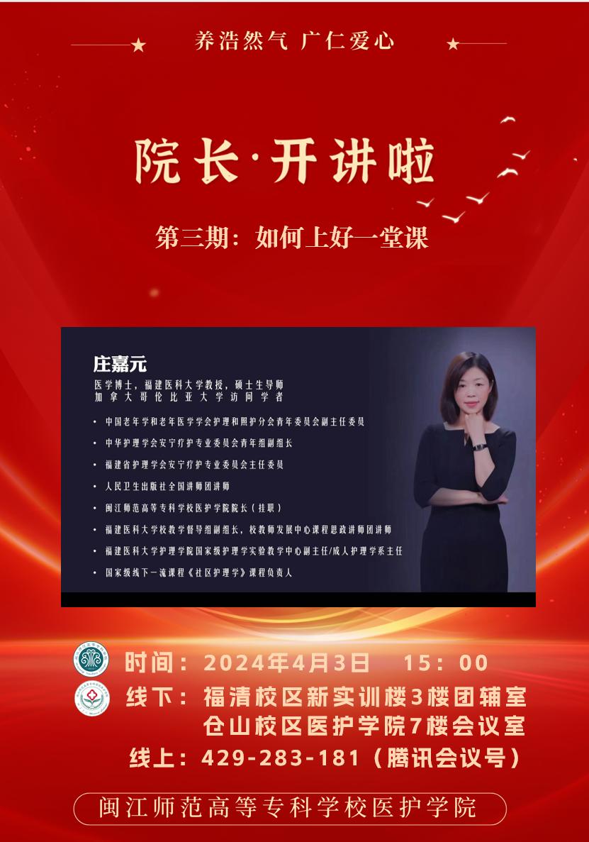 为进一步提升教师教育教学能力,2024年4月3日下午,医护学院院长庄嘉元教授在仓山校区、福清校区通过线上-线下结合的方式召开了“院长·开讲啦”系列讲座—《如何上好一堂课》。医护学院全体教师、其他学院部分教师及部分兼职教师参加了本次讲座。