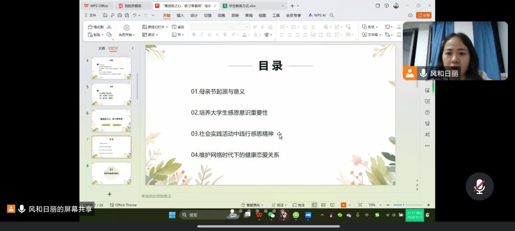 在“秉感恩之心,致寸草春晖”主题教育活动中,医护学院通过举办线上线下多种形式的感恩活动,让学生们深刻体会到了感恩的重要性。各位辅导员从母亲节的起源和现代意义出发,延伸出培养大学生感恩意识重要性。鼓励大学生们应该在社会实践中践行感恩精神,积极参加志愿者活动、关爱弱势群体与倡导绿色环保。真正做到内化于心,外化于行。
