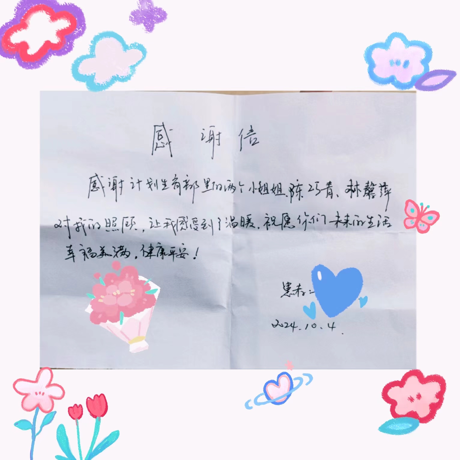 在这封感谢信中患者提到了俩位同学在她手术期间给了自己足够的人文关怀,让自己感受到了温暖;对自己的照顾让自己放下害怕的心理。