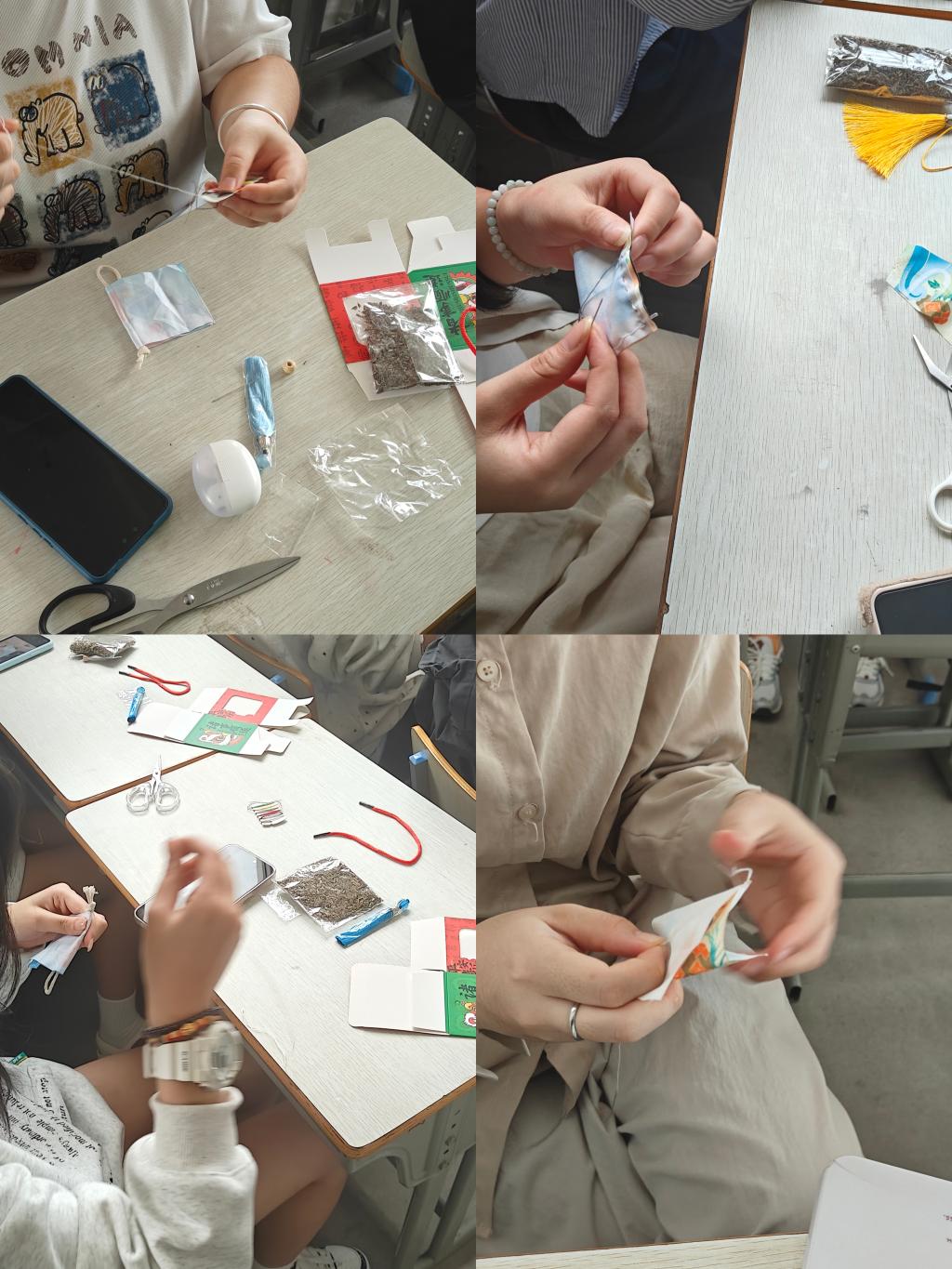 同学们围坐在一起,桌上摆满了各式各样的材料,大家各司其职,积极参与本次活动,致力于将自己的创意融入香囊之中。在这个过程中,她们互相帮助,共同探讨,不仅学会了香囊的制作技巧,更激发了的创新思维。每个人都沉浸在创作的喜悦中,仿佛时间都静止了。