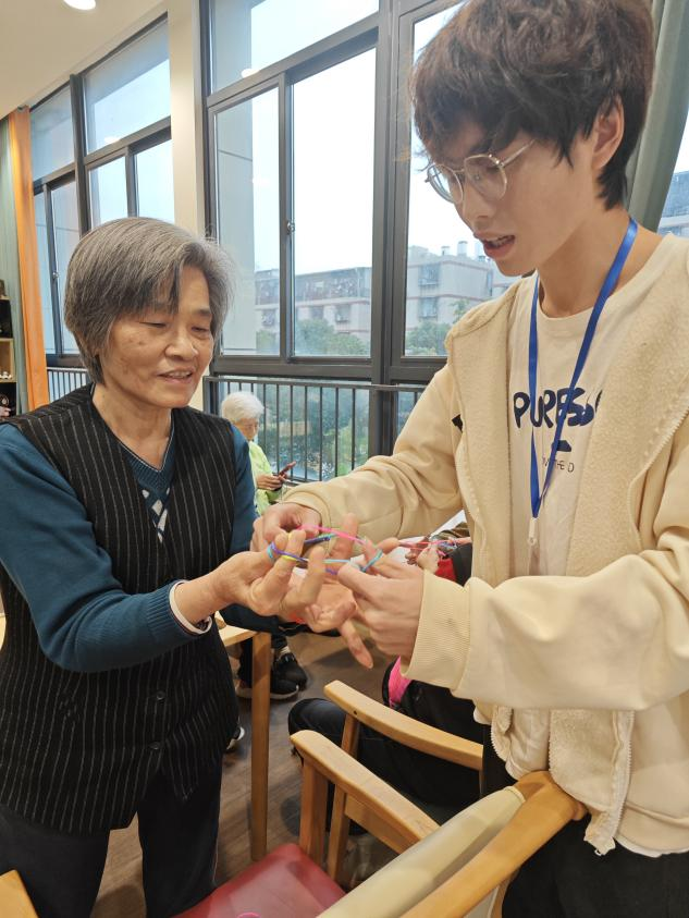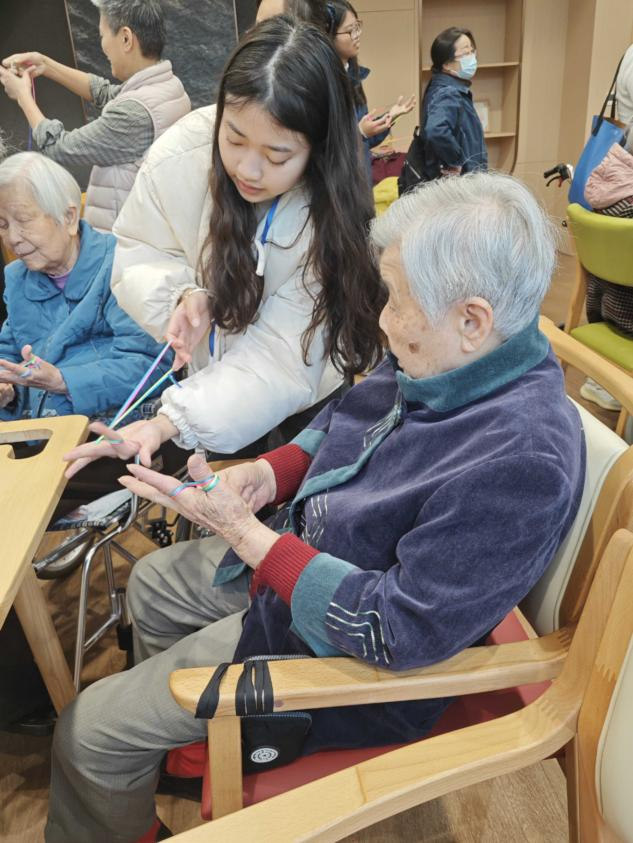 活动中,志愿者们引入了翻花绳游戏,这是一项既简单又充满乐趣的传统活动。他们耐心地指导老人们掌握翻花绳的技巧,老人们也兴致盎然地投入学习。很快,活动室内便回荡着翻花绳的节奏和老人们的欢声笑语。这种互动不仅提升了老人们的手眼协调能力,还让他们重温了童年的欢乐时光。