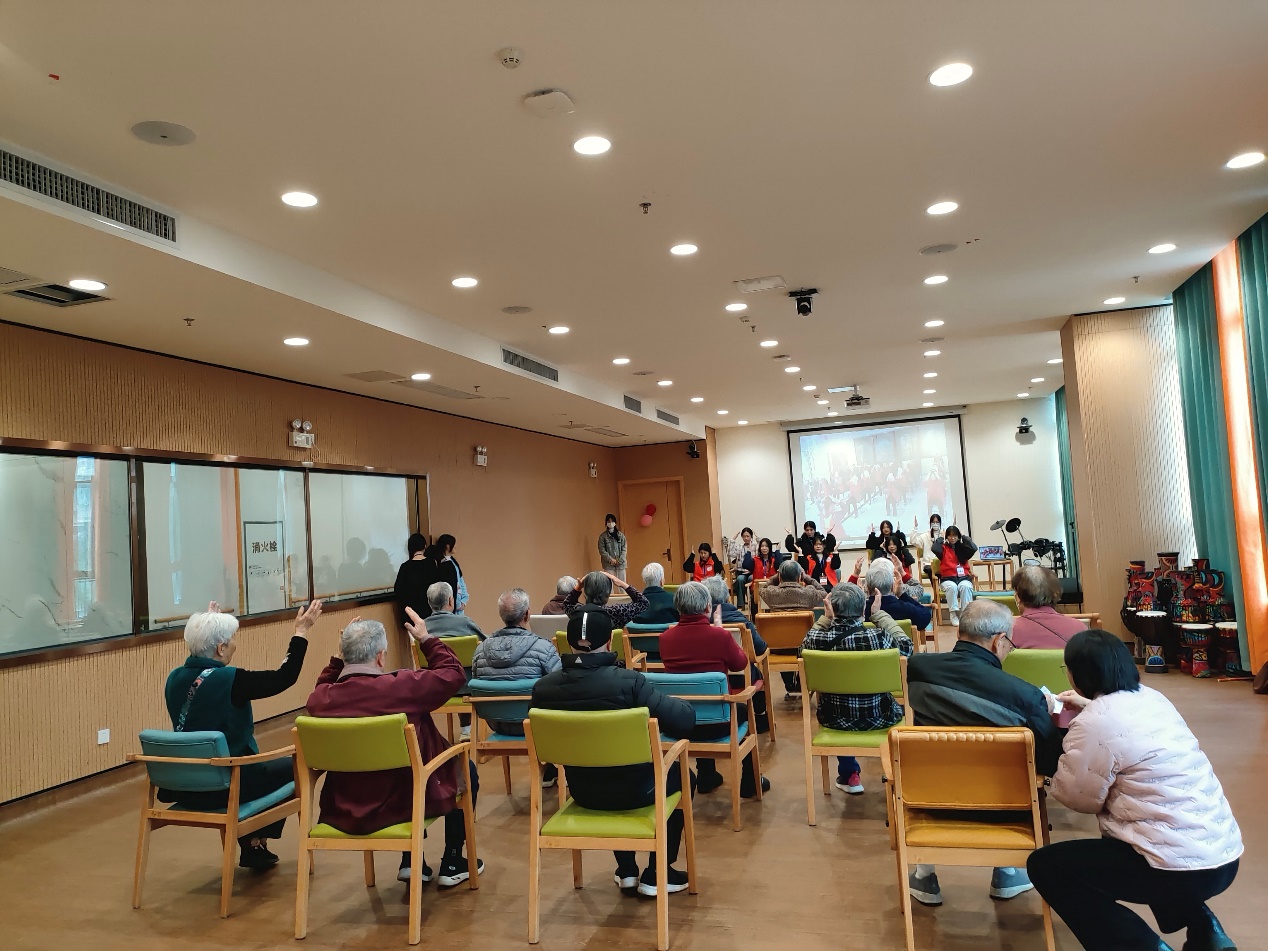 在活动开始之前,光大养老院的工作人员带领同学们深入了解老人们的居住环境、日常饮食、适老化的专利产品以及丰富的娱乐设施,也进一步激发了同学们的思考:我们可以从哪些方面去关怀老人?活动环节:当欢快的音乐响起,爷爷奶奶们跟随着音乐进行手部协调性训练,他们脸上洋溢着欢快、热情与坚定。