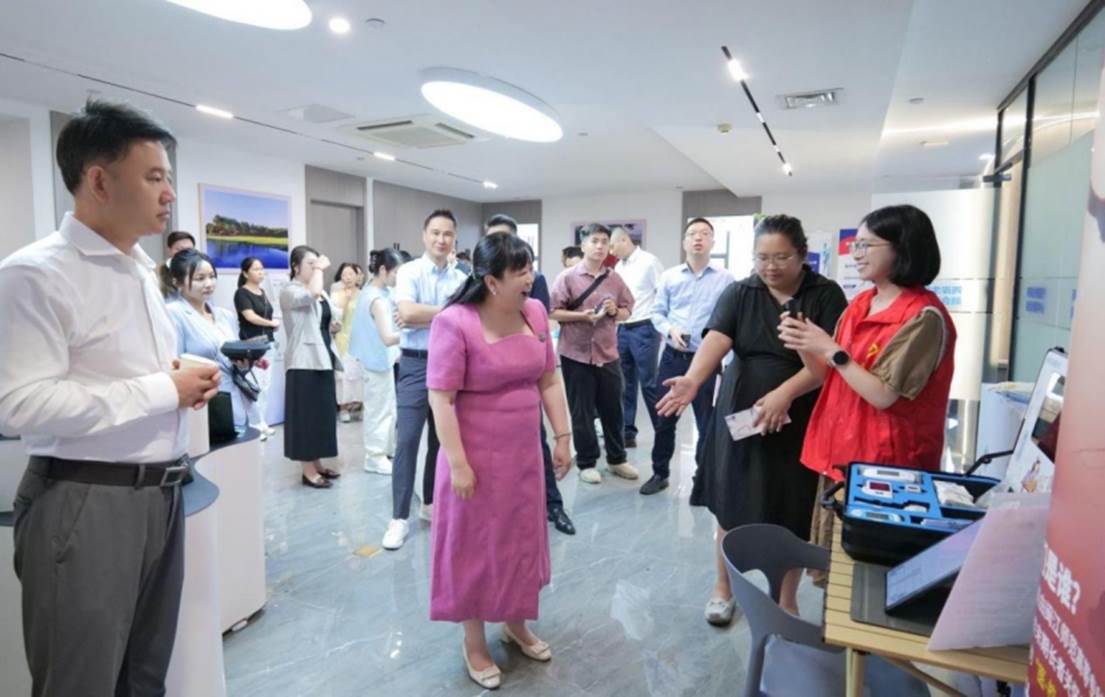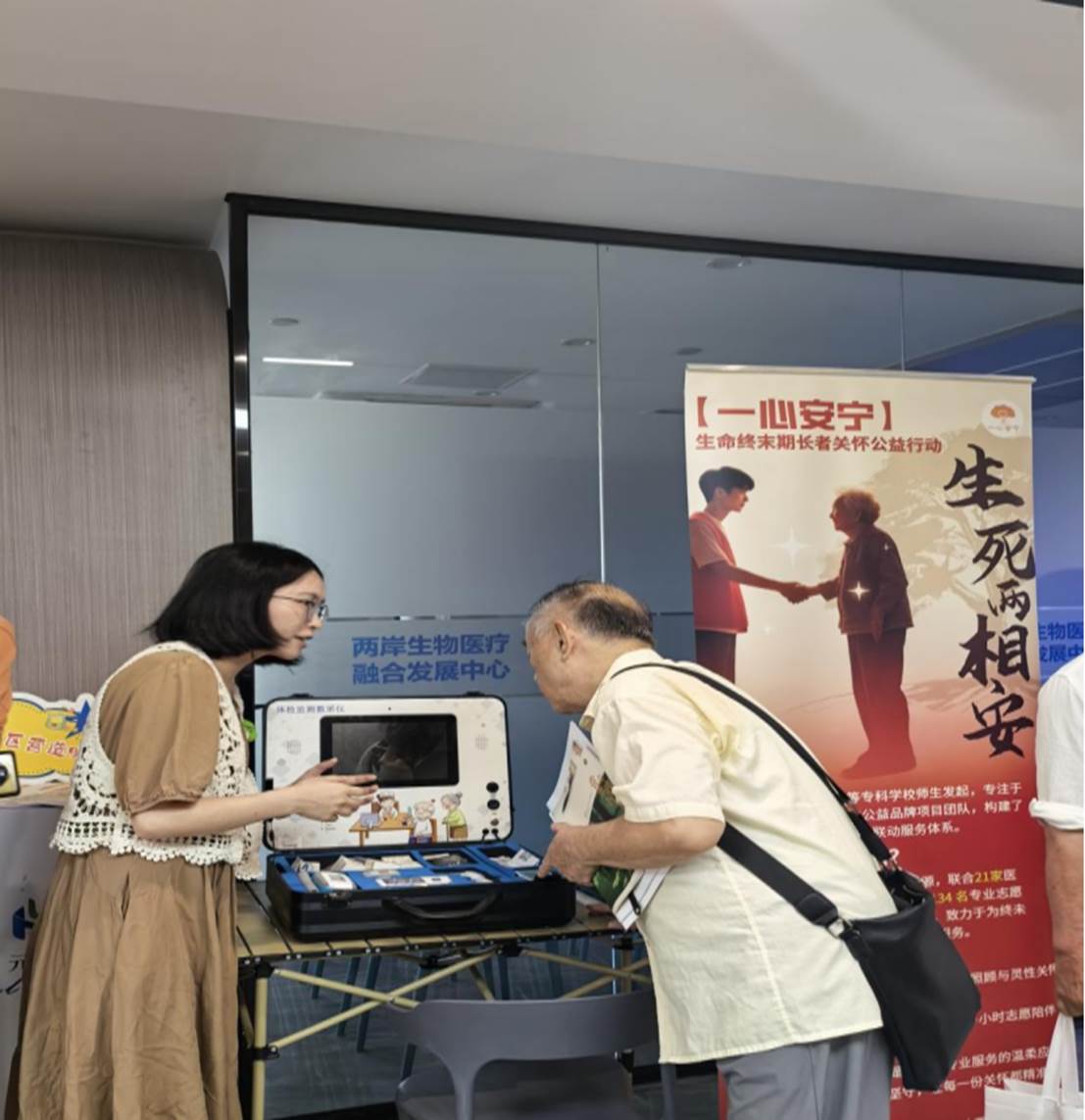 活动现场,“一心安宁”的展位聚集了许多参展者驻足,志愿者为到场人员演示“慧护老”智能监测设备及“AI叙事护理系统”,同时为长者们免费监测血压、心率、血氧等。数据通过智能系统实时上传,成为展示“科技+人文”照护理念的窗口。