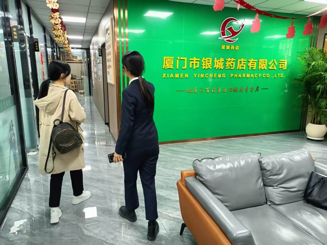 抵达企业后,厦门银城药店有限公司人事部的叶小榕和施欣怡热情接待了佘雪花老师及随行学生。企业方首先带领师生们参观了公司的办公区域、药品储存仓库以及零售门店,详细介绍了企业的运营模式、业务范围和发展规划。在参观过程中,学生们对药品从采购、储存到销售的整个流程有了直观且深入的了解。