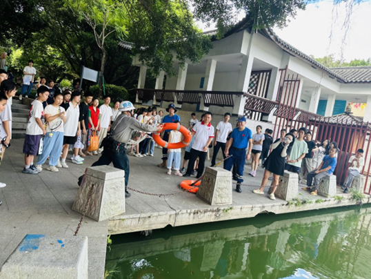 在户外实操环节,救援队员在公园水域现场演示了水上救援技巧,包括救生圈抛投、救援杆使用、拖带上岸等关键动作。参与人员积极尝试,在专业指导下亲身体验救援工具的使用,进一步巩固了理论知识,增强了应对突发情况的信心。