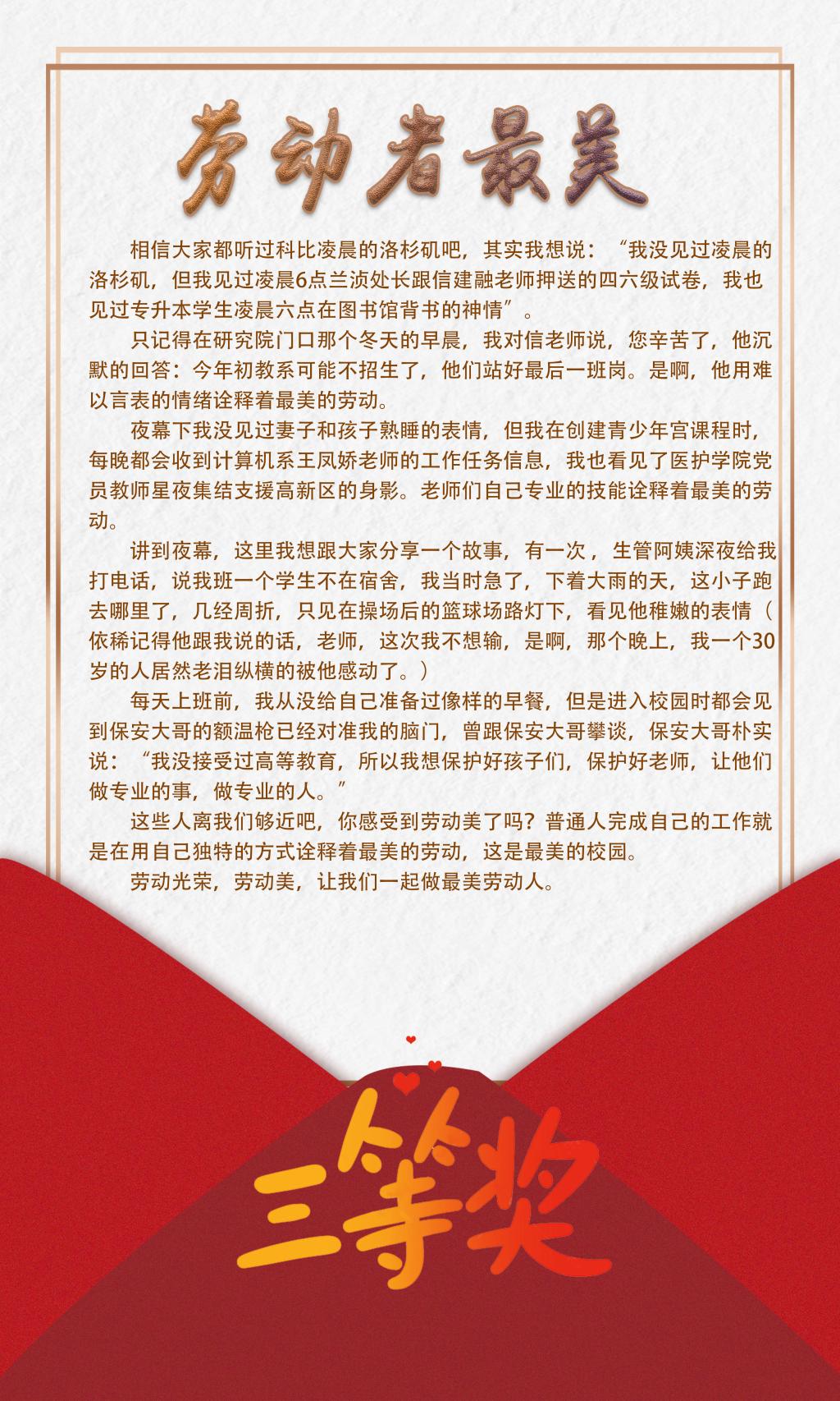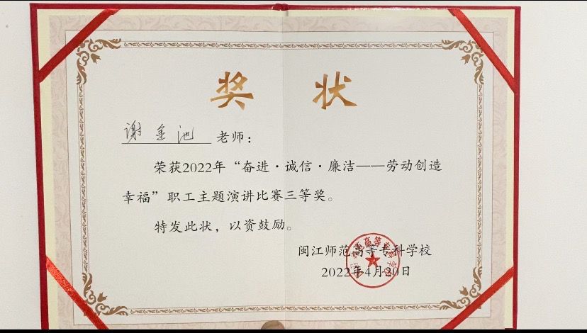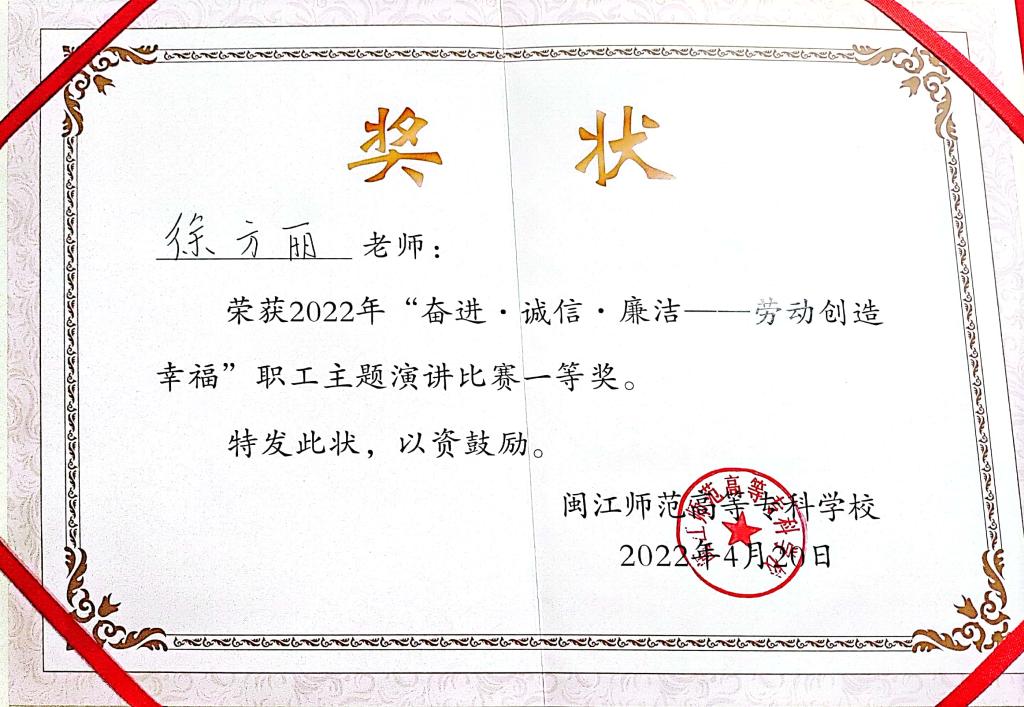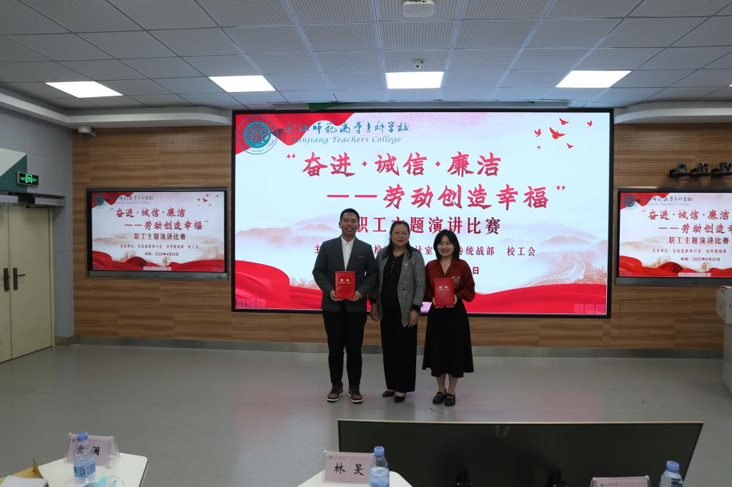 4月20日下午, “奋进·诚信·廉洁——劳动创造幸福”职工主题演讲比赛在闽江师专旗山校区落下帷幕。经过选手激烈的角逐和评委评比,医护学院徐方丽老师获得此次演讲比赛一等奖,谢金池老师获得此次演讲比赛三等奖。