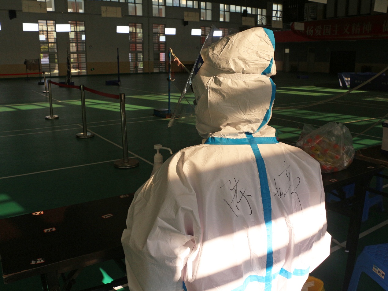 首次上岗的“大白”战队完成300多人核酸采集工作。核酸采集结束后,志愿者们仍未懈怠,严格遵守操作规范,从外到内、从上到下,一点一点“解除武装”。身上的衣服已经全部湿透,橡胶手套里全是汗水,只为打赢抗疫防控阻击战。