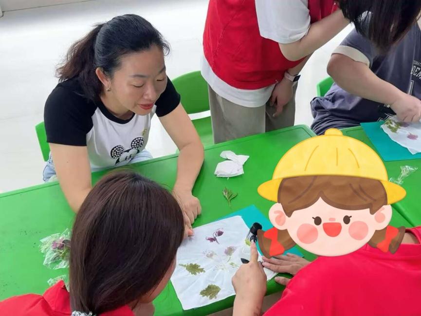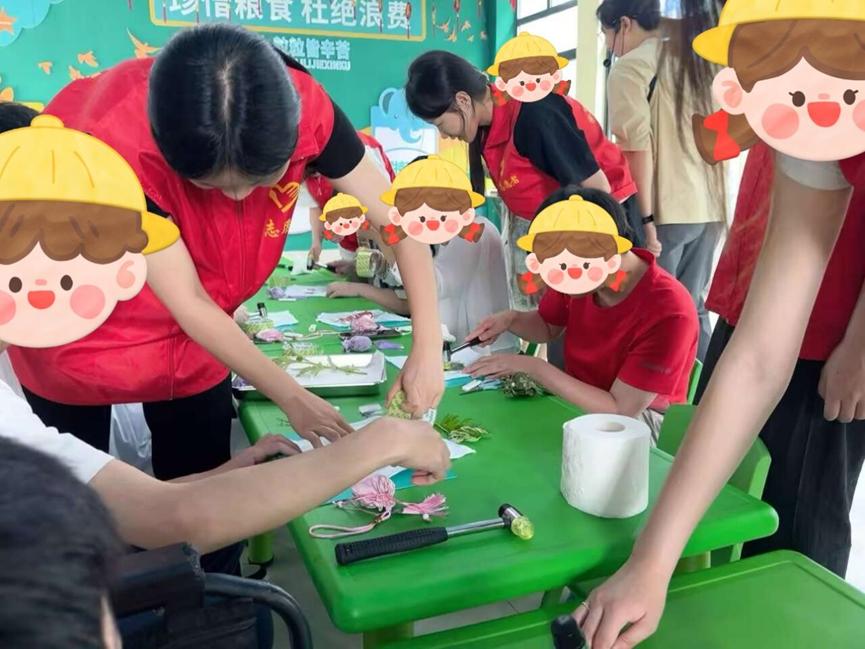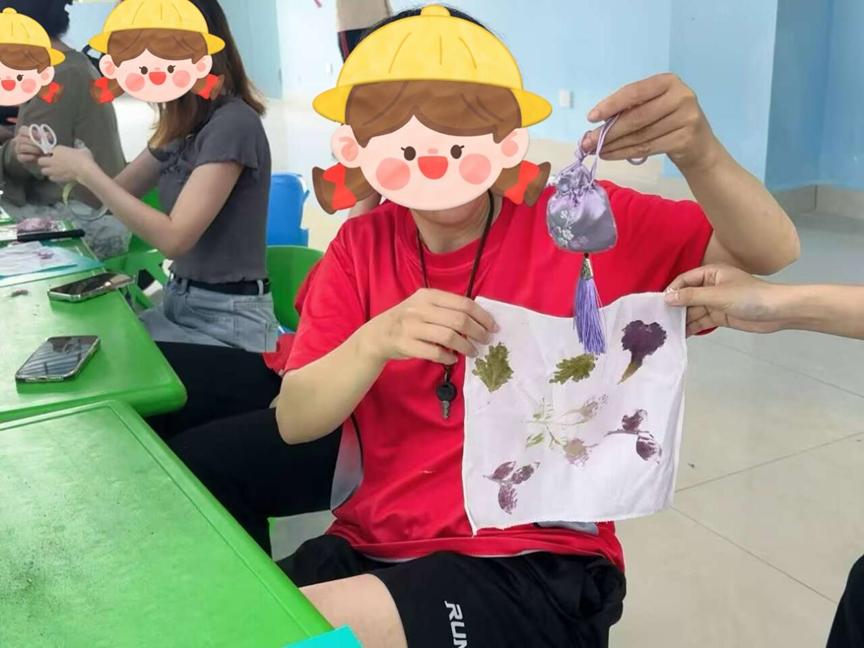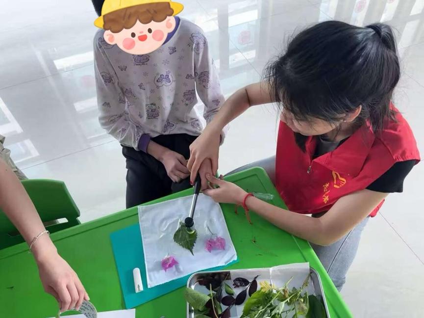 党员教师先给参与者们分发艾叶、陈皮等常见中药材,讲解了中药的特性,接着志愿者们带领大家一起完成艾草香囊的制作,最后是拓染环节,每个参与者选出自己喜欢的新鲜草药,在棉布上构思图案布局,用胶带固定后,通过硅胶锤均匀敲击,将植物的自然纹理完整拓印在方巾上,形成独特的本草图案。福利院的孩子非常喜欢。