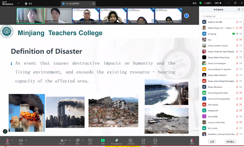 医护学院叶玉平老师和佘雪花老师应邀参加本次活动。叶玉平老师作为特邀讲者,以“Disaster Nursing: Field Triage and Response Strategies”(灾害护理:现场分诊与应对策略)为主题,在结合典型案例分析灾难护理重要性的基础上,详细讲授了现场分诊的原则、方法以及灾害应对中的护理策略。她强调,在灾害发生时,准确快速的现场分诊能够有效分配医疗资源,提高救援效率,挽救更多生命;而科学合理的应对策略则是保障受灾群众获得及时、有效医疗救助的关键。两位老师参与了后续的主题讨论环节。