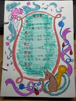 为了保持宿舍清洁,8-123制定了高效又有趣的值日制度:每天早晨,1床负责擦窗户;3床清扫并拖地;4床检查物品摆放,确保衣物叠整、书籍归位。有固定的轮值安排,每两人搭档值日,安排写在显眼处,谁负责什么一目了然。同时有“激励”机制,忘记值日的同学第二天多干一天,外加请大家吃冰棍!据说这个“惩罚”效果奇佳,没人愿意“破财”!