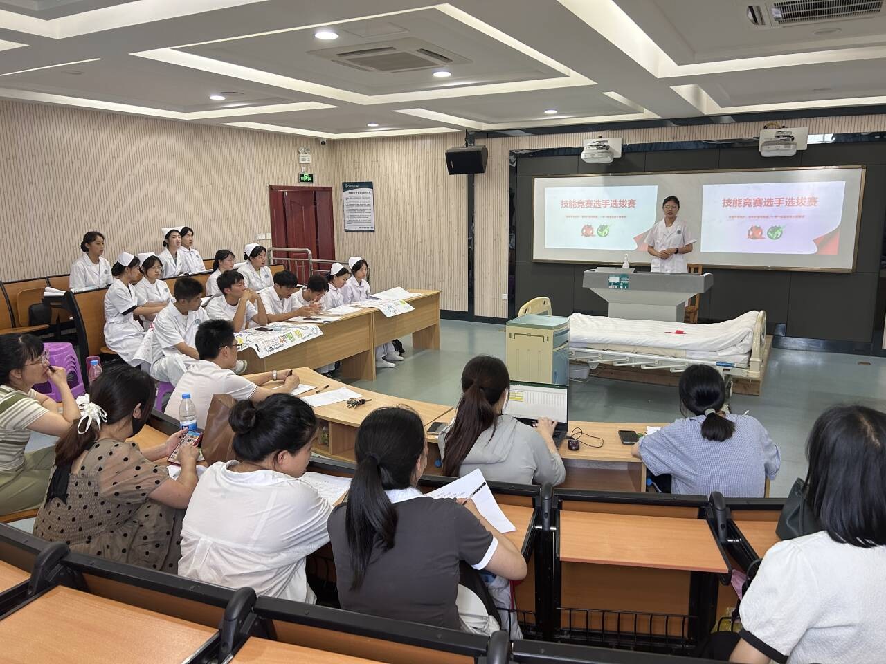 为做好我院技能竞赛种子选手选拔工作,健康养老相关赛项指导教师团队联合医护学院团委于2024年6月23日举办了以“健康守护,技能领航”为主题的选拔赛。此次选拔由叶玉平、叶珊、周灵、陈苏莲、袁双、王振龙、颜超、陈凤钦、游晶晶9位教师作为评委,在团委学生会成员以及12名志愿者协力下选拔赛圆满落幕。