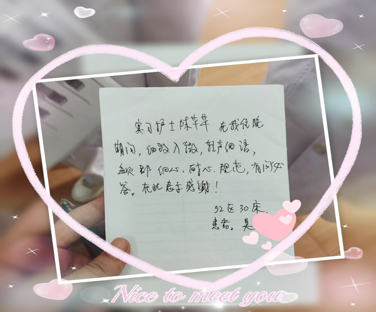 在感谢信中,患者特别提出实习护士陈芊芊在他住院期间,护理细致入微,轻声细语,有耐心、细心,有问必答,做事规范,让患者感觉特别暖心。我们常常提到优质护理服务,其实优质护理的核心就是“爱”。白衣天使,她们热爱着这份光荣的职业,努力用真诚、爱心书写着平凡而又光彩的人生,用自己的行动赢得患者及家属的信赖。