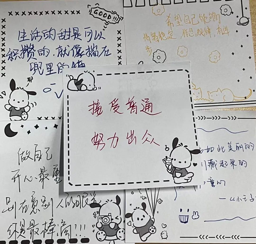同学们在便签上写下自己的焦虑或者烦恼,然后将便签丢进禁止焦虑盒子里,再写下一张鼓励自己或开心的便签贴在心理展板上。