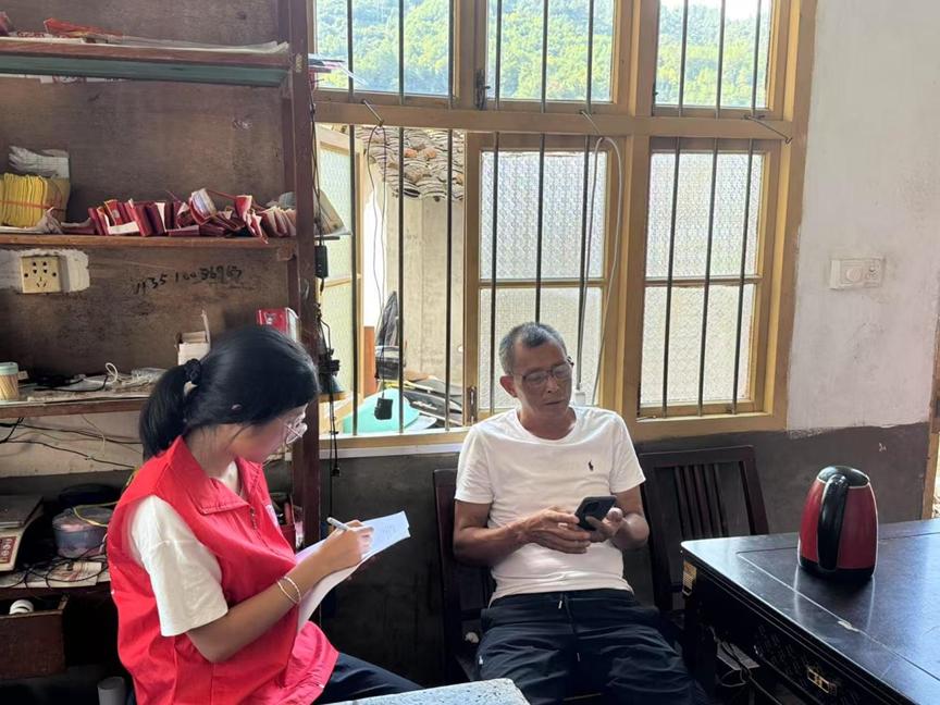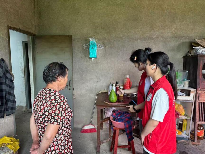 在助老服务环节,实践队队员们深入高龄、孤寡老人家中,协助打扫庭院、收拾杂物、普及健康知识,并以自编快板、歌曲联唱等形式丰富老人精神生活。与村民用方言深入交流一举,不仅拉近了彼此距离,还更真实地触摸到了基层民情。考虑到当前农村老龄化程度较高、居家环境管理亟待改善,队员们还走村入户调研老年人服务需求以及现有乡村卫生室运行情况,尝试为基层医疗与养老服务融合提供青年视角的可行性建议。