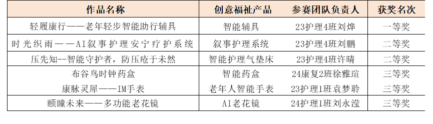 评审环节,五位老师依据创新性、实用性、安全性、可用性及可持续性标准进行评选(获奖名单见下图),确保了专业性与公正性。涌现的优秀作品,精准针对老年人日常痛点,充分体现了“科技+关怀”的核心理念。