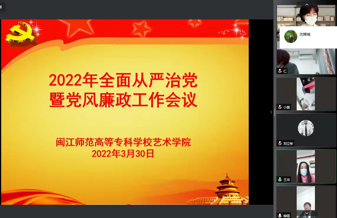 3月30日下午,艺术学院召开2022年全面从严治党暨党风廉政建设工作线上会议,传达贯彻全省教育系统全面从严治党工作视频会议和大赢家体育app下载2022年全面从严治党会议精神,回顾总结2021年学院全面从严治党工作和党风廉政建设工作,部署2022年工作任务。会议由艺术学院党委副书记林萍主持,艺术学院党政联席会议成员、各部门及教研室负责人、全体党员、全体思政教育工作者参加会议。