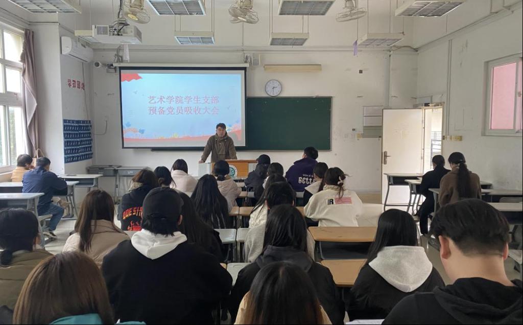 2023年12月19日,艺术学院学生党支部在教学楼2001教室召开接收预备党员大会,讨论通过接收詹诗因等4位同志为预备党员。艺术学院党委书记江柳青在会上上了一堂《坚定信念勇当先锋争做新时代合格共产党员》主题党课。会议由艺术学院党委青年委员、学生支部书记周宇航主持,艺术学院学生支部全体党员和入党积极分子代表参加。