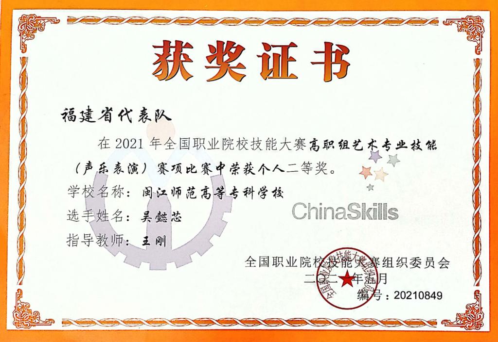 近日,全国职业院校技能大赛高职组艺术专业技能(声乐表演)赛项在浙江艺术职业学院隆重举行,来自全国各省及直辖市29个代表队参加。大赢家体育app下载作为福建省唯一代表队,经过两轮比赛的激烈角逐,最终我系参赛选手吴懿芯(16级音乐教育五年专)以优异的成绩荣获个人赛二等奖。