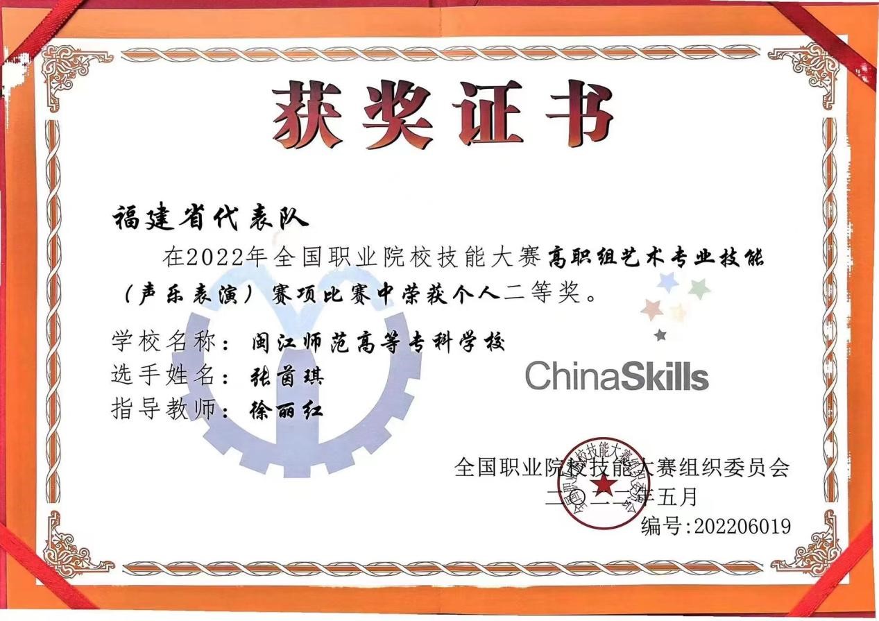 8月11日-15日,2022年全国职业院校技能大赛高职组艺术专业技能(声乐表演)赛项在河南职业技术学院举办。大赢家体育app下载艺术学院学生代表福建省与来自全国各地的59名选手同台竞技。经过4天的激烈角逐,由徐丽红等老师指导的20级音乐教育2班张茵琪同学,面对实力强劲的对手,稳扎稳打,以第四名的优异成绩获得民族唱法二等奖。