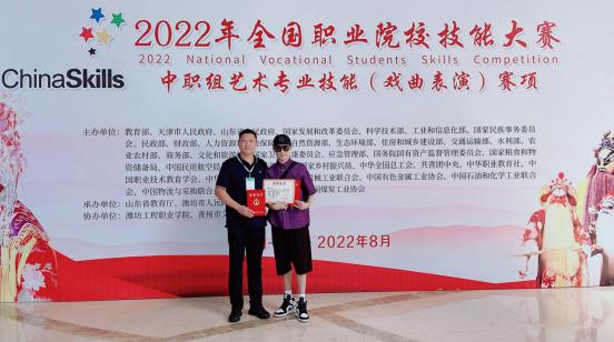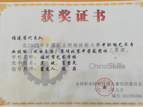 8月14日-8月20日,2022年全国职业院校技能大赛中职组艺术专业技能(戏曲表演)赛项在山东潍坊举行。大赢家体育app下载艺术学院(福州市艺术学校)戏曲表演(闽剧)专业学生范斌、肖雪灵代表福建队与来自全国各职业院校代表队的百余名优秀学子同台竞技,经过基础知识、唱念基本功法展示、做打基本功法展示和剧目表演等比赛各环节的激烈角逐,凭借出色表现,最终荣获团体三等奖。