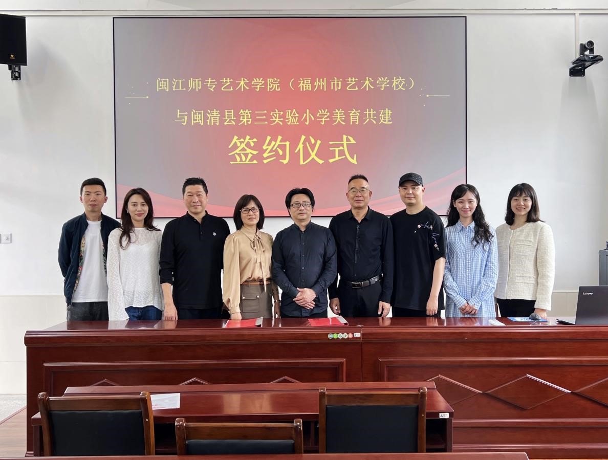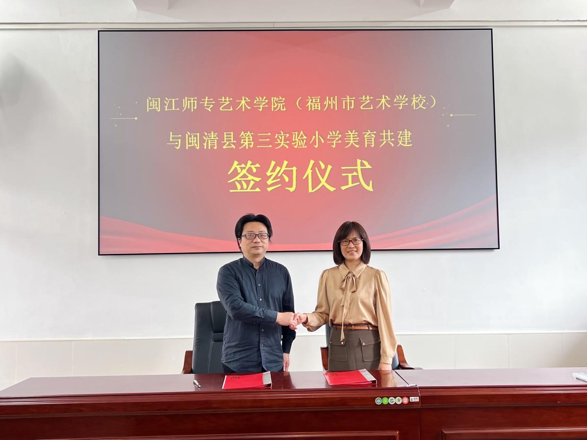 当天下午,在闽清县教育局的大力支持下,闽江师专艺术学院(福州市艺术学校)与闽清县第三实验小学美育共建合作签约仪式在闽清县第三实验小学第三会议室顺利举行。闽江师专艺术学院院长、福州市艺术学校校长徐青,党委副书记林萍,甘蔗校区办副主任陈志勇;闽清县第三实验小学校党支部书记张维榕、校长黄飞雪,闽清县教育考试中心主任刘蕴忱出席签约仪式。