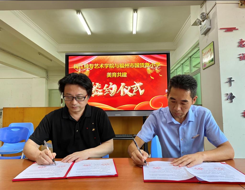 为深入贯彻落实习近平总书记关于教育的重要论述和全国教育大会精神,推进新时代学校美育改革发展,根据“教育部办公厅关于开展体育美育浸润行动计划的通知”(教体艺厅函(2019年)41号)、福建省教育厅组织实施体育美育浸润行动计划及福州市教育创建美育示范基地校等文件精神,按照“资源共享、优势互补、文明共建、协同发展“的原则,近日,闽江师专艺术学院(福州市艺术学校)与福州市国货路小学签订美育共建协议,结成共建单位。艺术学院院长、福州市艺术学校校长徐青,艺术学院副院长、福州市艺术学校副校长林理杰,艺术学院学生党支部书记、团委书记周宇航,钢琴与器乐教研室副主任刘立彬,器乐教师李一盈,舞蹈教师郑雅匀;福州市国货路小学校长罗炳志及党政领导班子参加了本次仪式。