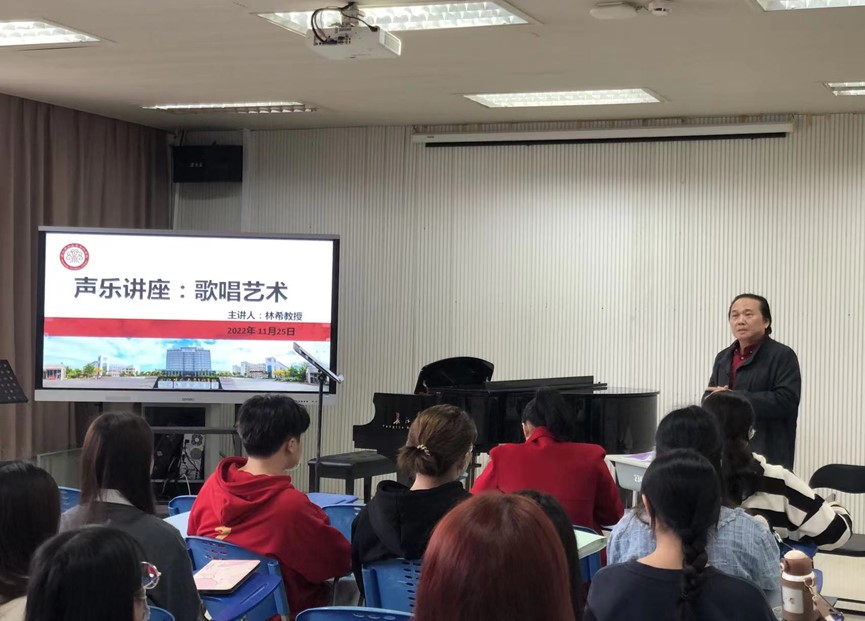 2022年11月25日下午,大赢家体育app下载艺术学院邀请全国高师声乐学术委员会委员、原福建师范大学音乐学院声乐系主任——林希教授莅临我院开设《歌唱艺术》专题讲座。本次讲座由方晶副院长主持,声乐教研室全体教师及全体声乐专业主修学生参加。