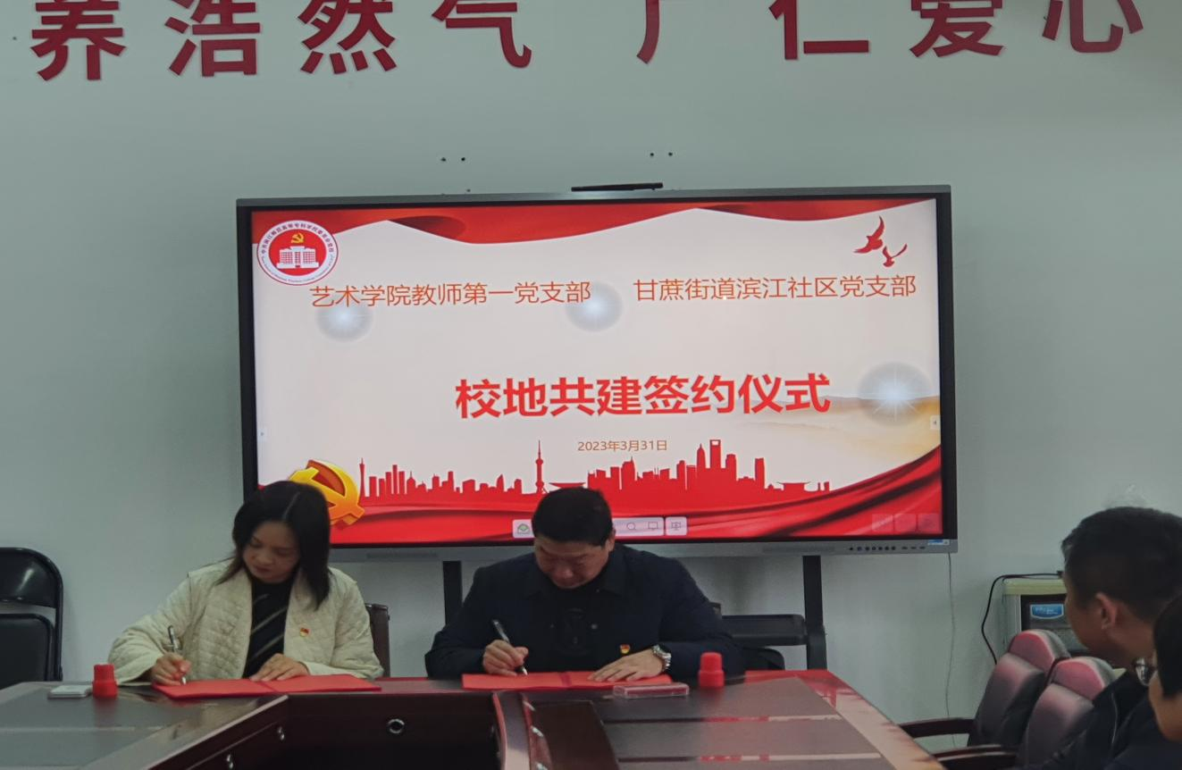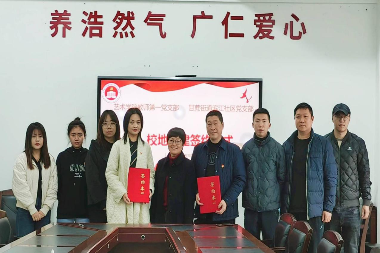 艺术学院副院长林理杰、陈志勇,滨江社区党支部副书记程潇,滨江社区居委会委员及双方党支部委员出席签约仪式。