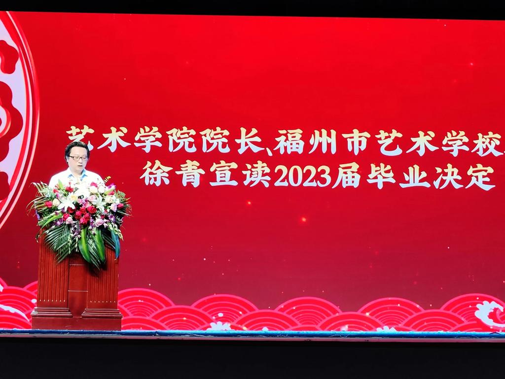 在毕业典礼环节,艺术学院院长徐青《宣读了福州市艺术学校关于准予2023届学生毕业的决定》。校党委书记陈荣生、校长杨建义为表演艺术(二元制)毕业生代表颁发毕业证书。艺术学院领导为福州市艺术学校2023届毕业生代表颁发毕业证书。